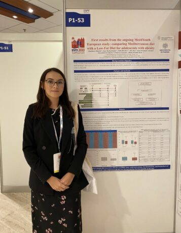 During her internship, Anna-Maria Shulhai also took part in the international Med4Youth project, which aims to study the connections between the Mediterranean diet and its benefits for children with obesity, the impact on changes in the intestinal microbiota, and the prevention of cardiovascular diseases. She presented a poster report on the results of the study “First results from the ongoing Med4Youth European study: comparing Mediterranean diet with a Low-Fat Diet for adolescents with obesity”.