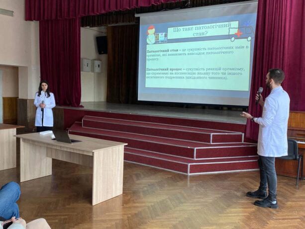 Students of Ternopil National Medical University R. I. Rudyi (MM-621) and A. O. Martyniuk (MM-621) organized a lecture on identification of life-threatening conditions for students of senior grades of Ternopil City Secondary School No. 11.