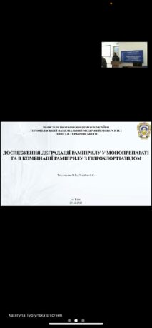 Kateryna Typlynska, in co-authorship with scientific supervisor Liliya Logoyda, presented a report on the topic “Study of degradation of ramipril in monopreparation and in combination of ramipril with hydrochlorothiazide”. The report was devoted to the study of the degradation profiles of ramipril and hydrochlorothiazide and establishing the possibility of using the method developed by the authors for the simultaneous determination of impurities of both components in the combined drug.