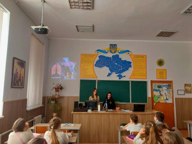 On February 19, 2024, students of TNMU Faculty of Medicine Olena Iskra (MM-416) and Diana Malyshevska (MM-416) gave a lecture on the topic “All about electronic cigarettes and energy drinks” for the 5th-grade students of Ternopil Academic Lyceum “Ivan Franko Ukrainian Gymnasium”.