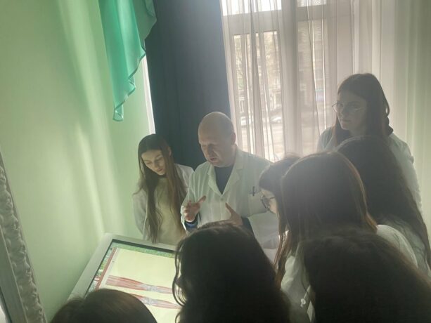 Associate Professor of the Department of Human Anatomy Yurii Havryshchuk spoke about the history of the creation of the department, guided the college students through the exhibition halls of the anatomical museum, focusing their attention on various departments (osteology, arthrology, myology, splanchnology). He demonstrated the preparations that are in the museum, virtual tables that facilitate the study of human anatomy, because thanks to the appropriate software, students are able to explore the structure of the human body in 3D format. The highlight of the excursion was the department’s “living corner” – an aquarium with exotic fish.