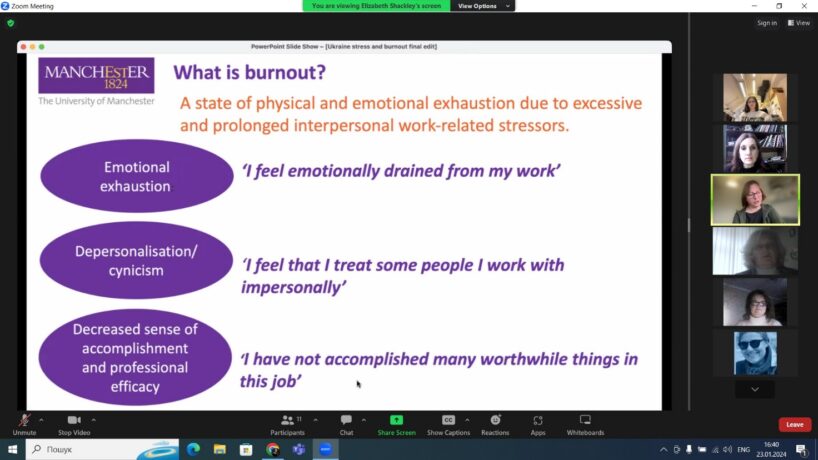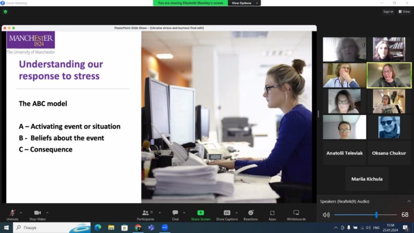 Previous interactive workshop “Recognizing and managing stress; preventing burnout” took place on January 23, 2024. The event was organized by Manchester Medical School professors Dr Elizabeth Shackley and Dr Rebecca Farrington. Rebecca Farrington has extensive experience working with migrants and currently works for the GMMH Trust’s Specialist Asylum Seeker Service and is Chair of WONCA (World Organization of National Colleges, Academies and Academic Associations of General Practitioners/Family Physicians) organisation Migrant Health. Liz Shackley is a Cardiology Paediatrician, 5th Year Medical School Academic Lead and Associate Head of Staff Development at Manchester Medical School, Compassionate Leadership Ambassador.