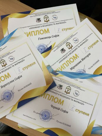The third-degree diplomas were awarded to Viktoria Balk, Yevhenia Mozhova, Natalia Lanova for the report “Influence of inositol on the development of oxidative stress in rats of different sexes with steatohepatosis” (supervisor – Professor Olha Denefil).