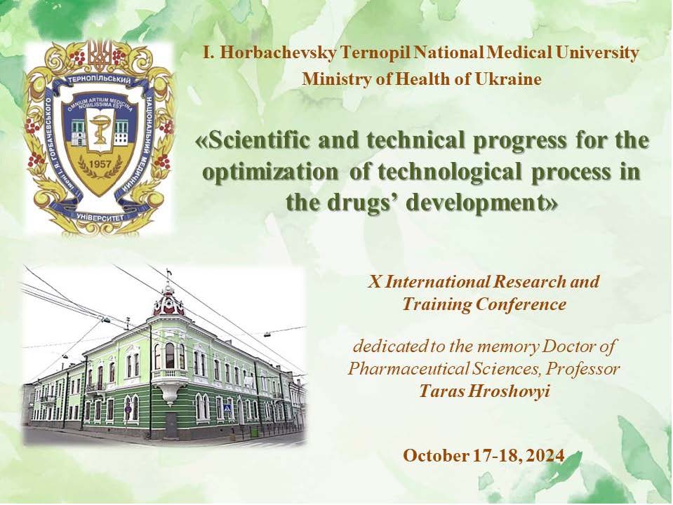 It’s our pleasure to invite you to participate in the X International Research and Training Conference «Scientific and technical progress for the optimization of technological process in the drugs’ development», dedicated to the memory Doctor of Pharmaceutical Sciences, Professor Taras Hroshovyi. The conference will be held online on October 17-18, 2024 at I. Horbachevky Ternopil National Medical University.