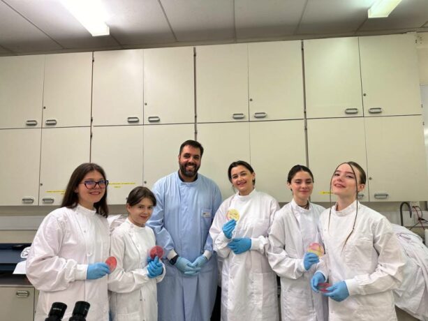 TNMU students with Dr. Stavros Panagiotou, showcasing the results of their practical work in the microbiology laboratory at the University of Manchester.