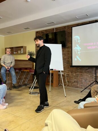 Another lecturer, Associate Professor of the Psychiatry Department Volodymyr Bilous, familiarized the audience with the neurobiology of meditation. During his presentation, he explained the anatomy of the brain structures involved in meditation and why meditation reduces anxiety.