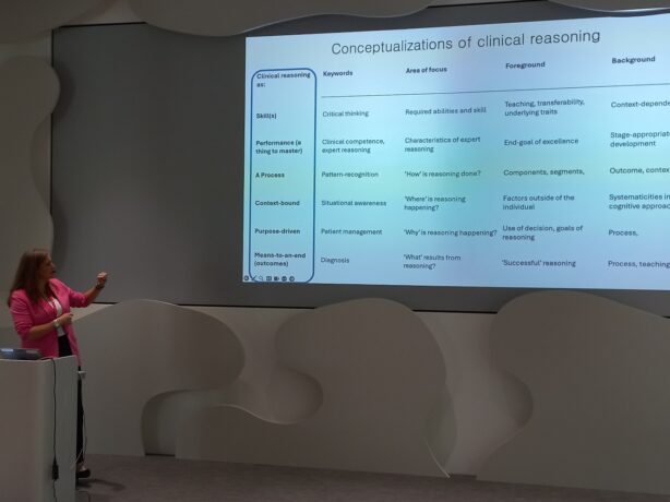 Meredith Young, Associate Professor and Assistant Director of Research at the Institute of Health Sciences Education at McGill University in Montreal, Quebec, Canada, shared a controversial view on clinical reasoning. Currently, the concept lacks a unified definition and understanding. Like “friendship,” we all understand it broadly, but defining its criteria can spark debate. Clinical reasoning is seen as diagnostic, therapeutic, critical, or problem-based thinking, among other perspectives, leaving much room for further research.