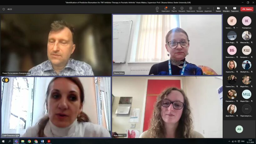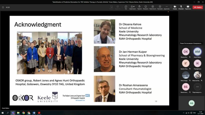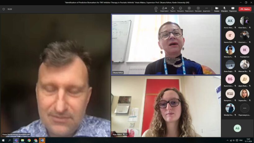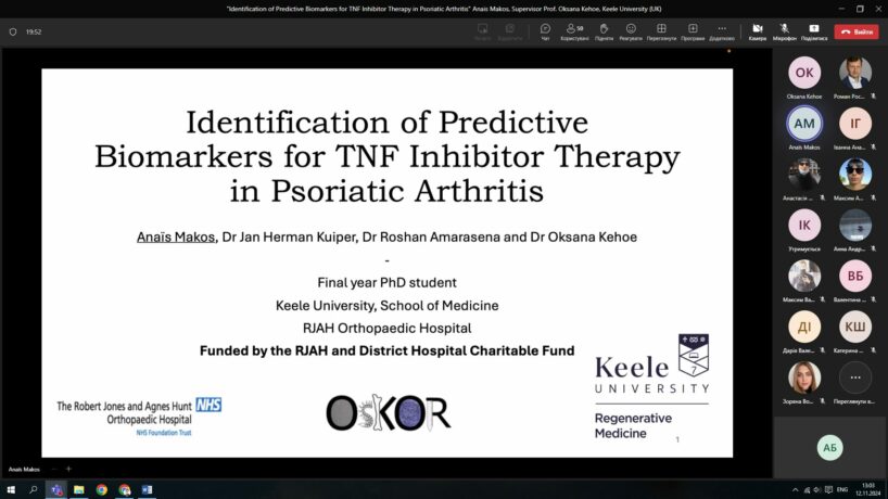 On November 12, 2024, Anaïs Makos, a doctoral researcher working under the supervision of Oksana Kehoe at Keele University’s School of Medicine in the United Kingdom, delivered an online lecture, “Biomarkers for Predicting Response to Tumor Necrosis Factor Inhibitor Therapy in Patients with Psoriatic Arthritis.” This session was the second in a series of presentations by Keele University researchers, following an earlier lecture on osteoporosis by Zoe Paskins.