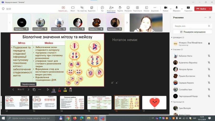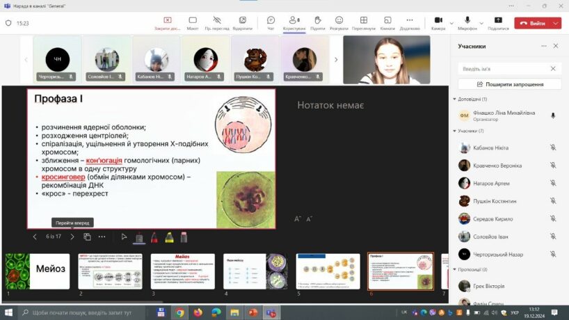 Kateryna Finashko connected the lesson topic to medicine, explaining that disruptions in meiosis processes can lead to genetic abnormalities and highlighting the importance of understanding meiosis for geneticists. She also discussed with the students the role of studying cell division in developing methods for treating oncological diseases.