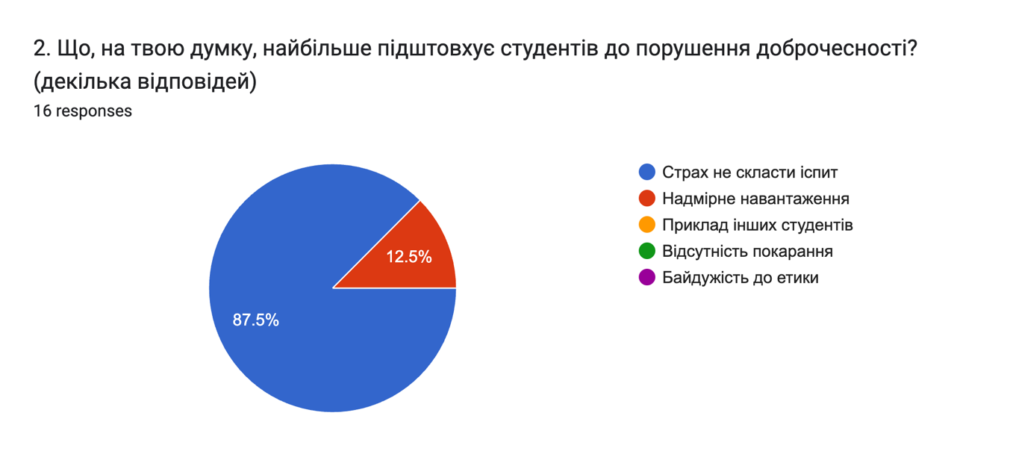At the end of the lecture, an anonymous survey “Academic Integrity and Krok-1: What Do You Choose?” was conducted. The results showed that students take academic honesty seriously when preparing for and taking exams.
