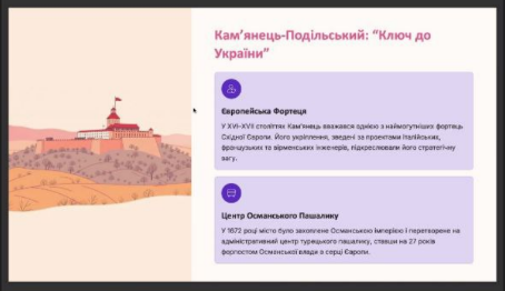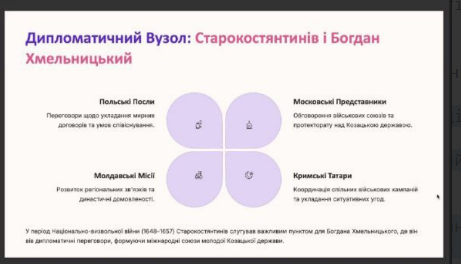 Equally engaging was the presentation by MM-220 student Volodymyr Musat, “International Relations of Khmelnychchyna,” as the lands of his home region have long been a strategic, trade, and cultural crossroads. He mentioned such fascinating places as the Kamianets-Podilskyi Fortress, Bakota, the impressive Starokostiantyniv, Medzhybizh, and Khmelnytskyi itself in the context of historical events.