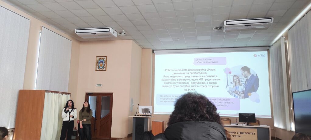 Iryna Lebed, Global HR Business Partner at Acino, presented the company’s history, its main areas of activity, and its international presence. Alla Kotyk, Regional Development Manager of the Western Region, along with Medical Affairs specialists Iryna Romaniuk and Nataliia Kutsenko, shared their professional experiences, the requirements for pharmaceutical company managers, and the specifics of working as a medical representative in modern conditions.