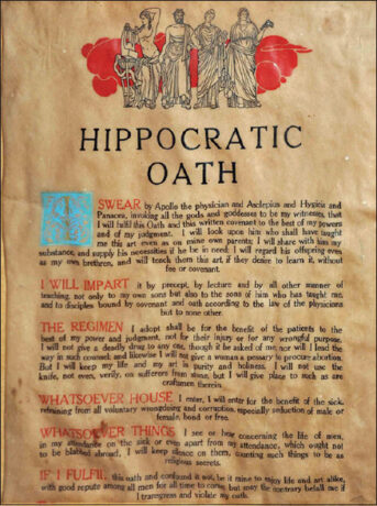 I swear by Apollo Physician and Asclepius and Hygieia and Panaceia and all the gods and goddesses, making them my witnesses, that I will fulfill according to my ability and judgment this oath and this covenant: