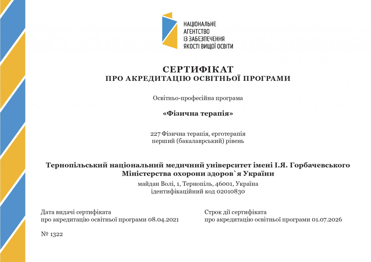 Висновок експертної комісії Міністерства освіти і науки України про підсумки проведення первинної акредитаційної експертизи освітньо-професійної програми «Фізична терапія » щодо підготовки фахівців зі спеціальності 227 «Фізична терапія, ерготерапія» галузі знань 22 Охорона здоров’я другого (магістерського) рівня вищої освіти.