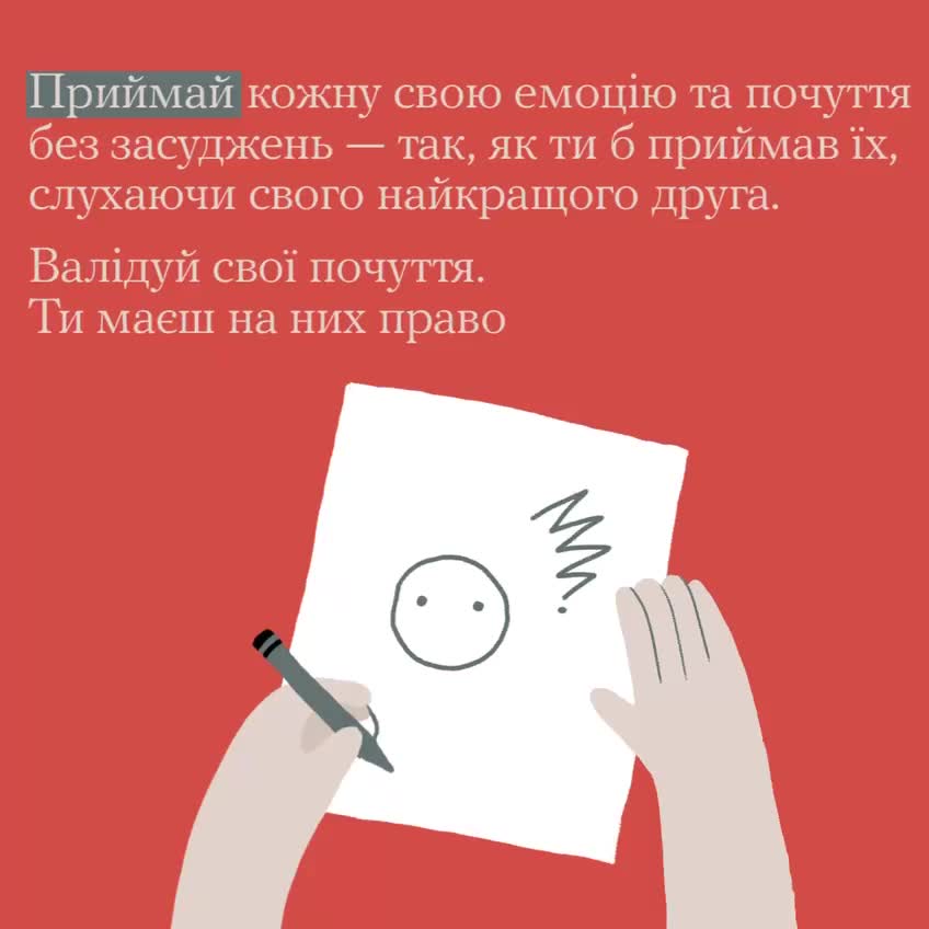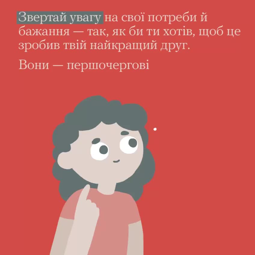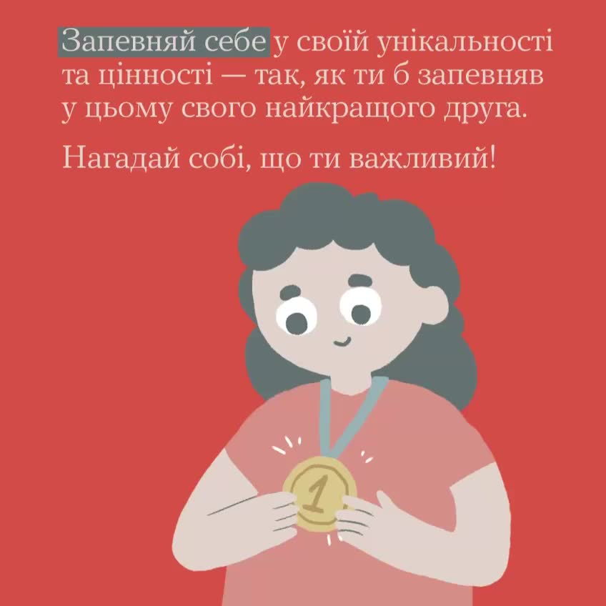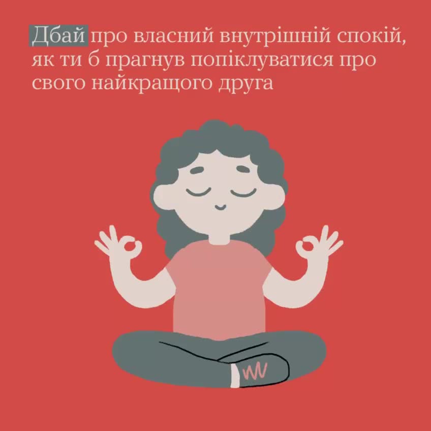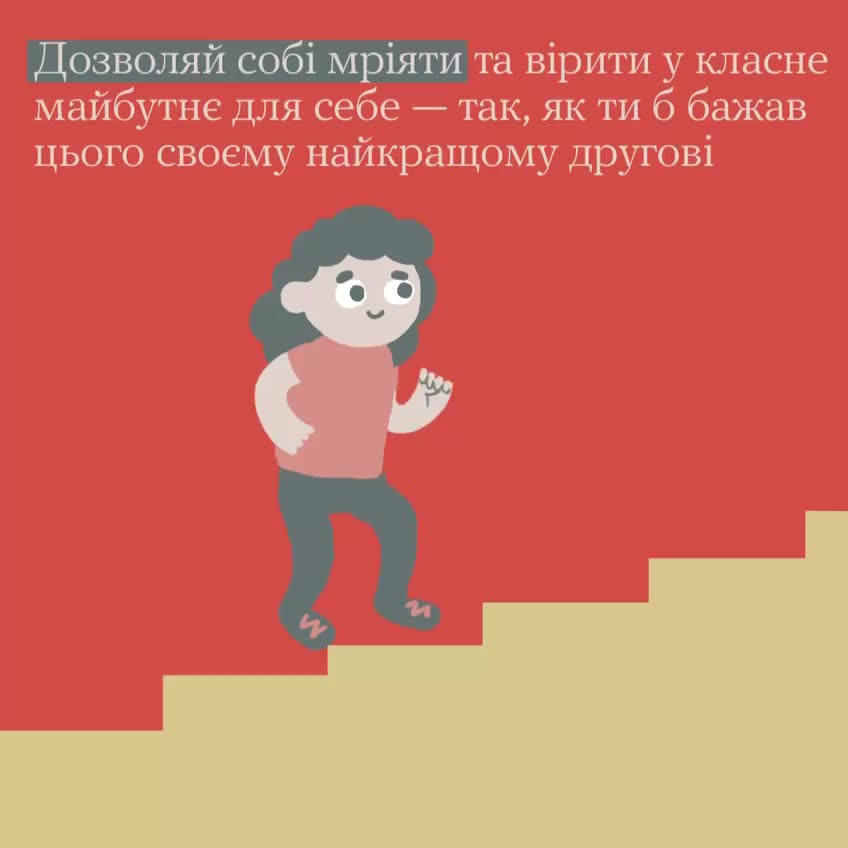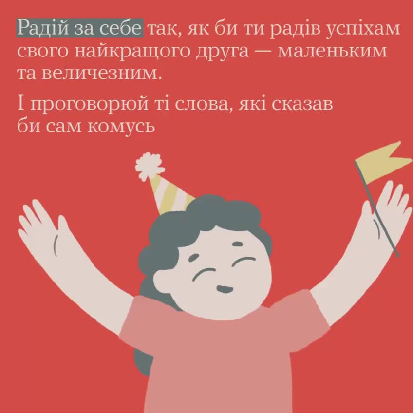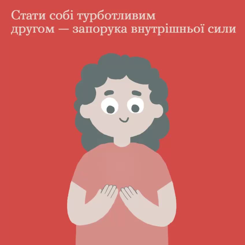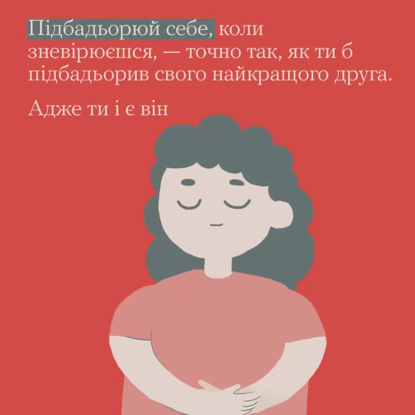 Коли ми натрапляємо на труднощі, то можемо бути жорстокі до себе. Ми можемо ображати та навіть карати себе. Але чи вчинив би ти так зі своїм найкращим другом? Чи сказав би ти йому, що він недолугий, або дав свою підтримку та підбадьорив тим, що ти поруч і віриш в нього?