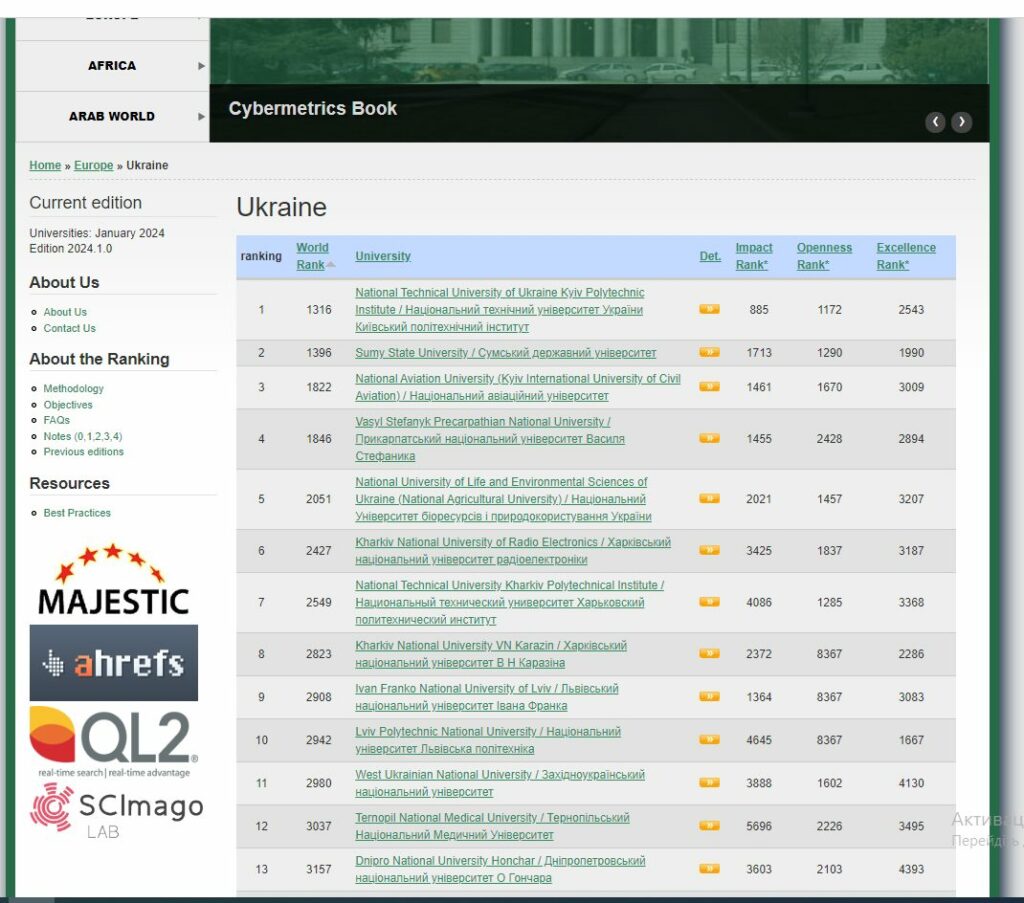 The Webometrics ranking has been compiled since 2004 with the aim of analysing the scientific potential of universities, their openness and readiness to exchange scientific and cultural achievements, and the academic presence of higher education institutions in the Internet space. When determining the position in the rating, the following indicators are taken into account: