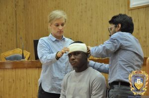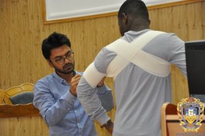 Traditionally, each meeting of the European Medical Students’ Association has a practical side. This time, clinical intern Amin Mudasar conducted a workshop on how to proper dressing and immobilizing injured parts of the body. Everyone was able to work on developing these skills.