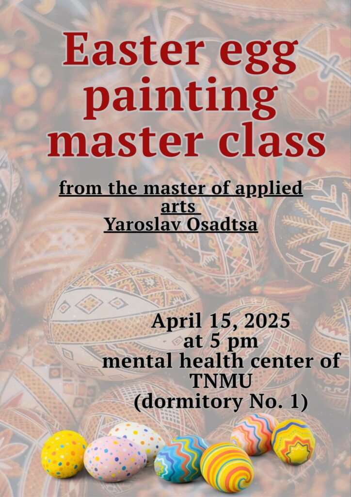 On April 15, 2025 at 5:00 PM, the Mental Health Center of TNMU (dormitory No. 1, Torgovytsia Street, 3) will host a master class in Easter egg making by the master of applied arts Yaroslav Osadtsa. We invite everyone who wants to take part in this artistic event, learn how to make Easter eggs (pysanky) or improve their skills. You need to have clean white empty eggs with you and a good mood. You must notify us in advance about your participation by email rudenko@tdmu.edu.ua