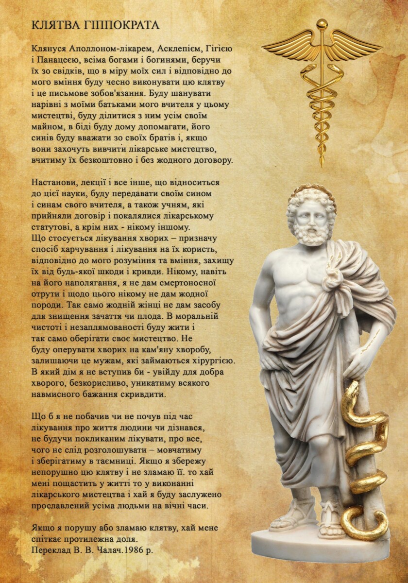 Клятва Гіппократа — виражає основоположні морально-етичні принципи лікарської поведінки. Клятва виникла, ще до часу життя Гіппократа. Згідно переказам вона переходила в усному вигляді з роду в рід, ще від прямих нащадків Асклепія. Гіппократом клятва була написана в V столітті до н.е. на іонійському діалекті старогрецької мови. З IІI століття до н.е вона стала документом, так як була записана в Александрії при Герофілі (близ. 335 –280 до н.е.) й Еразистраті (близ. 300 – 240 до н.е.). З того часу текст клятви безліч разів редагувався та перекладався різними мовами, що істотно міняє його сенс. Для свого часу вона була вагомим етичним досягненням. В християнському світі клятва була прийнята з певними змінами та поправками.