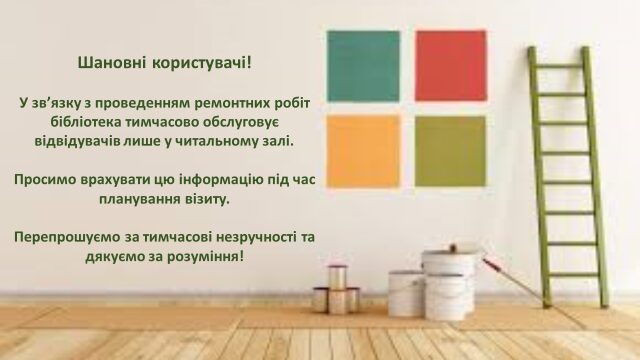 Шановні користувачі! У зв’язку з проведенням ремонтних робіт бібліотека тимчасово обслуговує відвідувачів лише у читальному залі. Просимо врахувати цю інформацію під час планування візиту. Перепрошуємо… Читати далі »Оголошення!