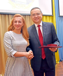 Ректор ТНМУ, професор Михайло КОРДА вручає Почесну грамоту Кабінету Міністрів України керівниці центру симуляційного навчання, асистентці кафедри медицини катастроф та військової медицини Галині ЦИМБАЛЮК