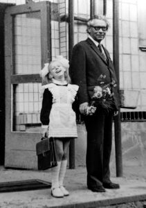 Перший раз у перший клас. Олена ПРОЦІВ з дідусем Пилипом Корнійовичем КОБЕРНЮКОМ (1977 р.)