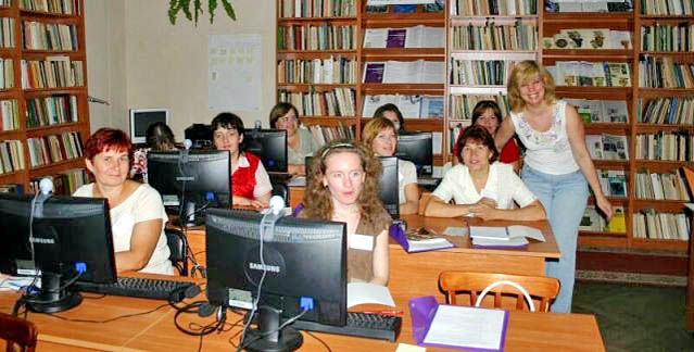 Олена ПРОЦІВ (праворуч стоїть) з учасниками тренінгу за програмою «Бібліоміст» (ОУНБ, 2010 р.)