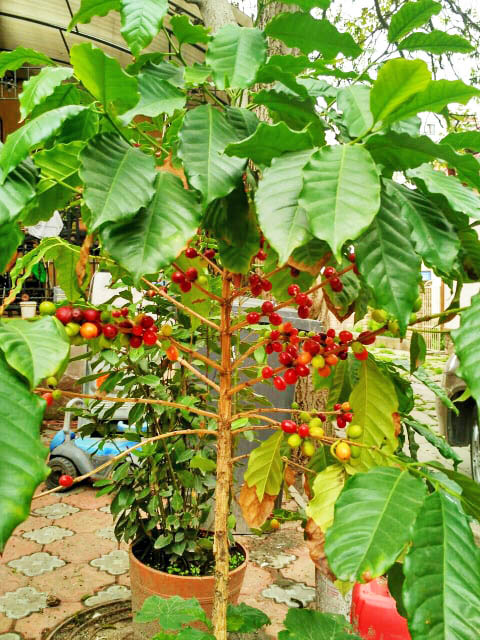 Кавове дерево цвіте здебільшого навесні, але може влітку й восени, білими квітами, їх аромат чимось схожий на кликічку. Стиглі ягоди – темно-червоні, схожі на черешню. Мають по двоє зернят, їх вилущують і обсмажують. Зі зрілого дерева можна зібрати майже 1,5 кілограма зерен. Виходить кава міцніша за куповану. Коли кавовий кущ стане великий, треба підрізати, щоб на гілці залишилися лише чотири пари листків.