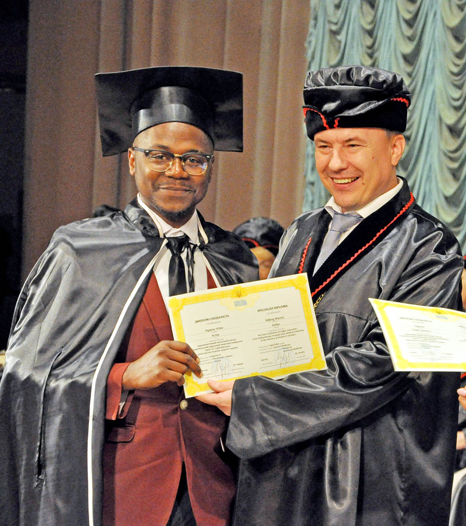 Випускники Бабас Пуамус ОКІ, Омоніджо Опейемі ЕСТЕР, Ісігузо Прешес Джачімайк ЧІКА з ректором ТНМУ, професором Михайлом КОРДОЮ (2018 р.)
