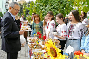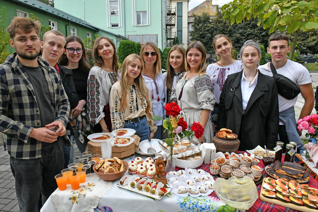«Наша група – збірна, – розповідає її представниця Олександра Сироєд. – У ній багато студентів, які приїхали торік до Тернополя з Харківщини, Херсонщини, Запоріжжя, вирвавшись з окупації, або ж хтось устиг і раніше. Тож ми організували тематичний стіл, на якому є харківське сало, запорізькі канапки, херсонський оселедець і, звичайно, кавун».