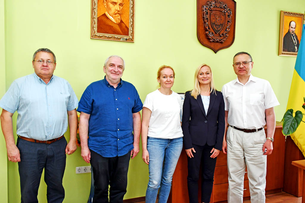 (Зліва направо): проректор ТНМУ, професор Степан ЗАПОРОЖАН, професор Гаральд ТОЙФЕЛЬСБАУЕР, докторка Мар’яна ТОЙФЕЛЬСБАУЕР, професорка Крістін РАДКЕ, ректор ТНМУ, професор Михайло КОРДА