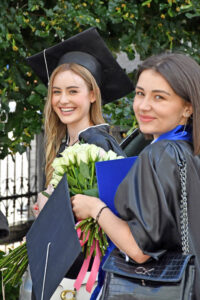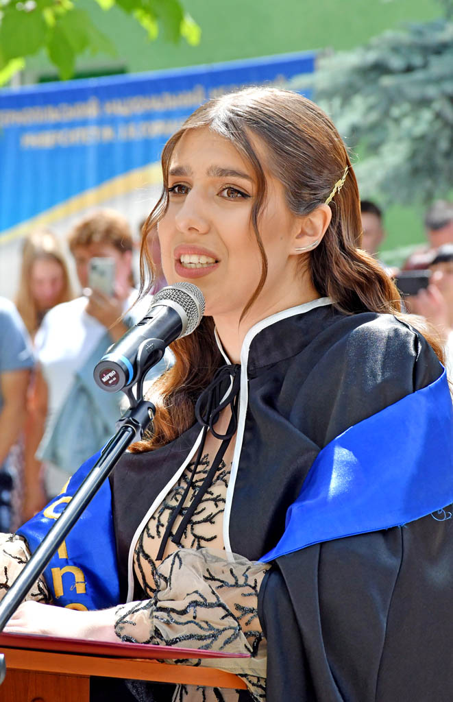 Слово від випускників мовила студентка шостого курсу медичного факультету Дарина Камінська, яка передусім подякували всім військовим ЗСУ. «Завдяки нашим бійцям маємо можливість стояти тут та урочисто відзначати закінчення університету. Саме для них ми зробили свій випускний подарунок: наш пікап і дрон уже допомагають Збройним силам України. Тож дякую усім, хто долучився до збору, – звернулася до присутніх Дарина Камінська. – Від імені випускників дякую також усім батькам, які були безпечною гаванню впродовж усіх цих років. Вони надихали нас, вірили в наші здібності, підтримували, відмовляли від того, щоб забрати документи після першої негативної оцінки й точно знали дати найважливіших іспитів. Слухали наші розповіді про практичні заняття, писали з нами історії хвороби та хвилювалися за результати «Кроку», навіть якщо до цього не були дотичними до медицини. Тож цей диплом належить так само нашим батькам, як і нам.