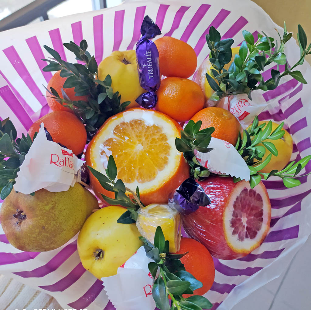 Це лише на перший погляд здається, що нічого складного в тому, щоб скласти їстівний букет немає. Насправді виглядає цілком інакше. Має бути продумано все до дрібниць. Насамперед слід обрати свіжі та якісні овочі, фрукти чи м’ясні вироби. Залежить від того, який саме букет хочете зробити. Дуже часто я поєдную овочі з фруктами, квіти з фруктами чи ковбасу з овочами та горішками. Це додає букету певну родзинку. Інша справа – все це зібрати, щоб було гарно та не втрачало товарного вигляду. Для цього переглядала відеоуроки. Є дуже багато тонкощів. Наприклад, такі трави, як м’ята, петрушка, кріп, кінза в букеті дуже швидко в’януть, навіть якщо їх ставити у воду. На це треба зважати, бо композиція втратить свій вигляд і привабливість.