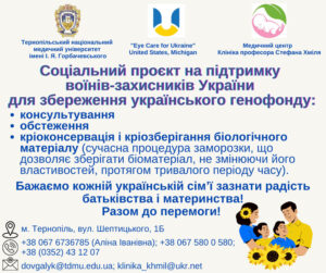 У Тернопільському національному медичному університеті імені Івана Горбачевського стартував унікальний соціальний проєкт щодо збереження фертильності військових – захисників України. До його реалізації долучилися доброчинна організація «Eye care for Ukraine» (США), що виступила фінансовим донором, і медичний центр «Клініка професора Стефана Хміля», де відбуватиметься практичне втілення проєкту.