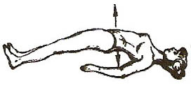 Лежачи на спині (мал. 4). Потилицею, ліктями та п’ятами впертися в підлогу. Зробивши глибокий вдих, трохи підняти тулуб і вигнути вгору живіт та тулуб. Затримати дихання й похитати тулубом з боку на бік 2-6 разів. Втягуючи живіт, зробити сильний видих. Утримати втягнуту в себе передню стінку живота 3-5 сек.