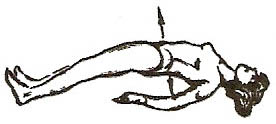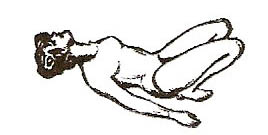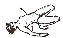 Лежачи на спині (мал.3). Впертися п’ятами та верхньою частиною спини в підлогу. Зробити вдих, прогнутися в попереку. Затримавши повітря, похитати спиною з боку на бік 2-6 разів, з кожним рухом намагаючись увібрати в легені ще трохи повітря. Втягуючи живіт, зробити сильний видих.