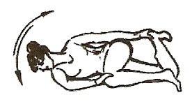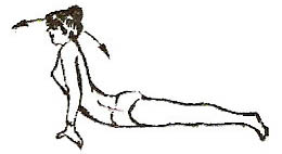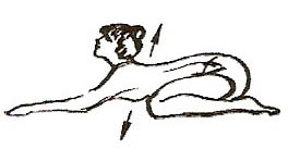 Лежачи на животі, впертися ліктями в підлогу, кисті рук на потилиці, ноги зігнути в колінах (мал. 11, 12). На глибокому вдиху відкинути голову назад, напружити м’язи живота, підняти живіт від підлоги та сильно прогнутися в попереку. Затримавши дихання на вдиху, виконати 2-6 рухів головою з боку на бік. Втягуючи живіт, зробити видих.