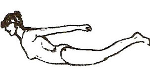 Лежачи на животі, випрямити ноги, руки вздовж тулуба, кисті в кулак (мал. 9, 10). На глибокому вдиху прогнутися в спині, відірвати від підлоги ноги. Руки відвести за спину. Затримати вдих і зробити 2-6 рухів-поворотів управо-вліво, торкаючись у кожному випадку плечем підлоги. Втягуючи живіт, зробити видих.