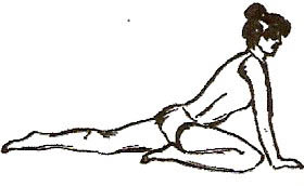 Сісти на підлогу на одну ногу, другу витягнути назад, випрямленими руками впертися в підлогу (мал. 15, 16). На вдиху підняти руки вгору, прогнутися в попереку. Затримати дихання та зробити 2-6 похитувань головою та тулубом уперед-назад. Опускаючи руки до підлоги, зробити сильний видих. Змінити ноги та повторити вправу.
