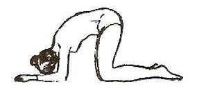 Сісти на п’яти, нахилити тулуб уперед, витягнувши руки вперед, торкнутися підборіддям підлоги (мал.14). На глибокому вдиху відвести голову назад, затримати дихання та виконати 2-6 похитувань верхньою частиною тулуба та головою. Втягуючи живіт, зробити видих.