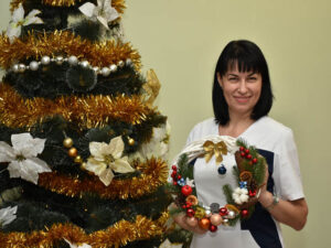 Медсестра приймального відділення Надія Николин святкову атмосферу прийдешнього року починає створювати задовго до самого свята. Нитки, гачок чи спиці – основні її помічники. Сплетені вручну іграшки зимової тематики надзвичайно милі, та й фантазії тут є де розгулятися. Такі ялинкові прикраси зв’язати можна досить швидко, а отже, за й нестандартно та красиво оформити ялинку! – Схеми я знайшла в Інтернеті, спробувала, доволі легко вдавалося, – розповідає Надія. – Так у мене з’явилися в’язані ялиночки, сніжинки, сніговики… Кольорову гаму і декор обираю на власний смак. Здебільшого власноруч вив’язані іграшки дарую друзям. На…