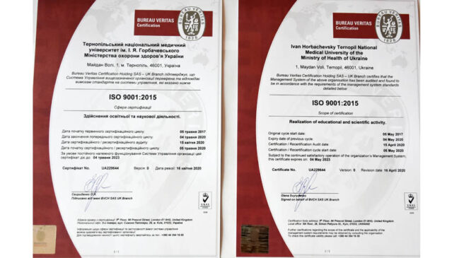 Цього року в Тернопільському національному медичному університеті імені І. Горбачевського відбувся ресертифікаційний аудит з міжнародного стандарту ISO 9001:2015 (управління якістю). За його результатами було прийнято рішення, що система якості в нашому закладі вищої освіти відповідає всім вимогам. ТНМУ вдруге отримав сертифікат і гравертон міжнародного стандарту ISO 9001:2015 на наступні три роки. Нагадаємо, що 26 травня 2017 року Тернопільський медуніверситет за результатами сертифікаційного аудиту, який провели зовнішні аудитори компанії Бюро Верітас Сертифікейшн Україна, вперше отримав сертифікат і гравертон міжнародного стандарту ISO 9001:2015 (управління якістю) за здійснення освітньої та наукової діяльності відповідно…