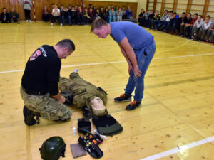 На запрошення викладачів Чортківського вищого професійного училища група інструкторів у складі асистента кафедри військової медицини та медицини катастроф Тернопільського державного медичного університету імені І.Горбачевського, заступника голови правління громадської організації «Медичний загін спецпризначення «Білі берети» Віктора Шацького, студентів нашого університету, які є інструкторами Молодіжного осередку Всеукраїнської ради реанімації Анастасії Гудими, Романа Гука та Романа Тарасюка 24 жовтня провели показове заняття з основ тактичної медицини для студентів училища. Інструктори розказали та показали практично, як надати допомогу в секторі обстрілу та в укритті, на етапі евакуації. Студенти училища мали достатньо часу, щоб спробувати…