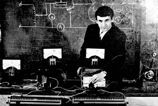 Роман ЛАДИКА демонструє зсув фаз між струмом і напругою в колі змінного струму на занятті з фізики (1974 р.)