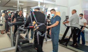 Після гострого періоду пацієнта переводять у відділення нейрореабілітації, основна мета якого – зменшити травму мозку та максимально сприяти одужанню пацієнта. Раніше, фактично з 2017 року, в лікарні функціонував лише нейрореабілітаційний блок, днями він переріс у велике просторе приміщення. У відділенні облаштовані комфортні палати з безбар’єрним простором, є побутова техніка, затишна, майже домашня атмосфера. Тут не лише стіни лікують, як зауважив один пацієнт, але й … двері, бо відчиняються вони одним помахом руки, а ще й чинять естетичний ефект – скляна панель виграє всіма барвами художнього полотна відомого турецького художника Хікмента Цетінкая. Ноу-хау відділення – зала фізичної терапії та кабінет ерготерапії, що обладнані найсучаснішою дороговартісною апаратурою. Зокрема, це модуль активної реабілітації (стелевий підйомник), який призначений для того, аби відновити рухові функції та навички активної ходьби, столи Бобата, мотомеди, вертикалізатори, блокова рамка. Особливу увагу варто привернути до бігових доріжок, що мають швидкість від 0,2 км/год, у той час, як всі звичайні бігові доріжки – 1 км/год. Одну з бігових доріжок придбали за кошти нашого університету для кафедри реабілітації, як і пристрій для відновлення когнітивних навичок, а саме комп’ютеризовану реабілітаційну рукавичку з опорами на праву та ліву верхні кінцівки. Цю апаратуру розмістили в кабінеті ерготерапії. Здається, що це не кабінет, а звичайна кухня, втім, її облаштували певними механізмами, щоб полегшити роботу пацієнтові. Крім хворих, у кабінеті ерготерапії можна зустріти й наших студентів – майбутніх фізичних терапевтів та ерготерапевтів, які відпрацьовують тут практичні навички.