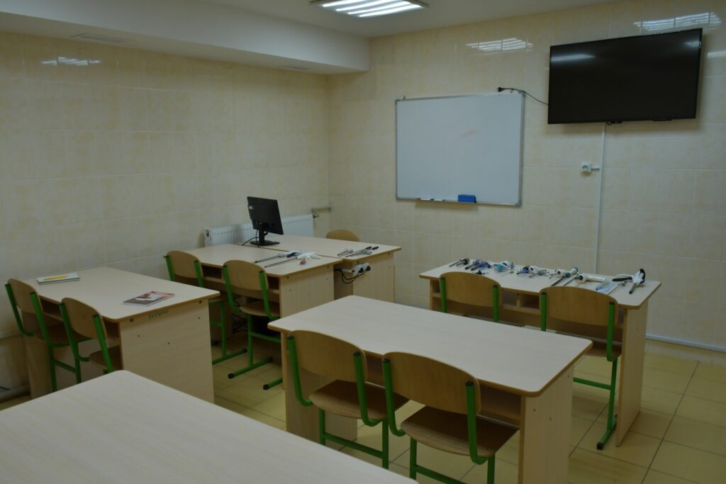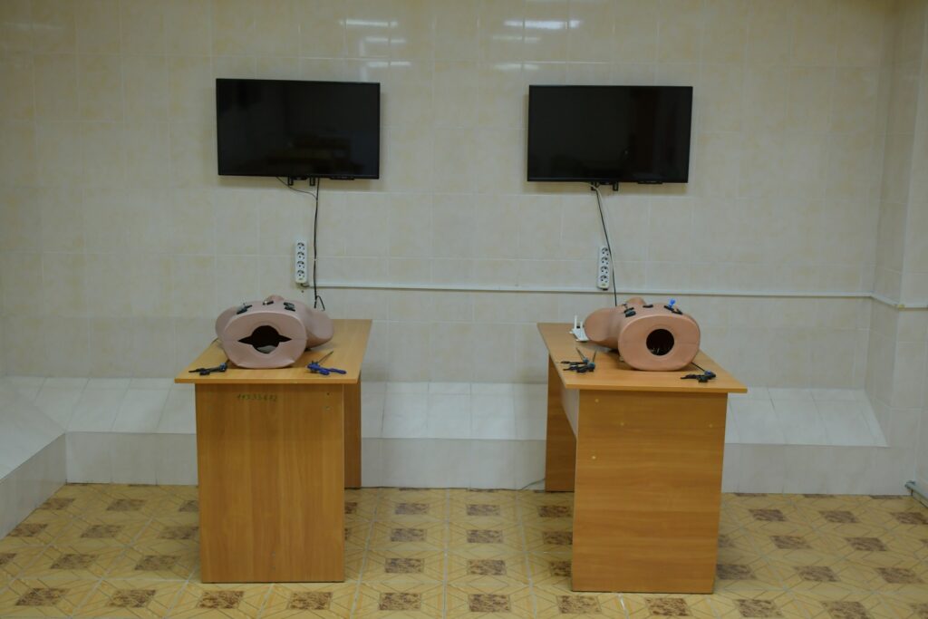 The material and technical facilities include simulators for mastering practical skills, instruments and equipment for laparoscopic interventions (a laparoscopic stand with all technical support), organ complexes, laboratory experimental animals, operating rooms for training, multimedia teaching aids, a video library, a library.