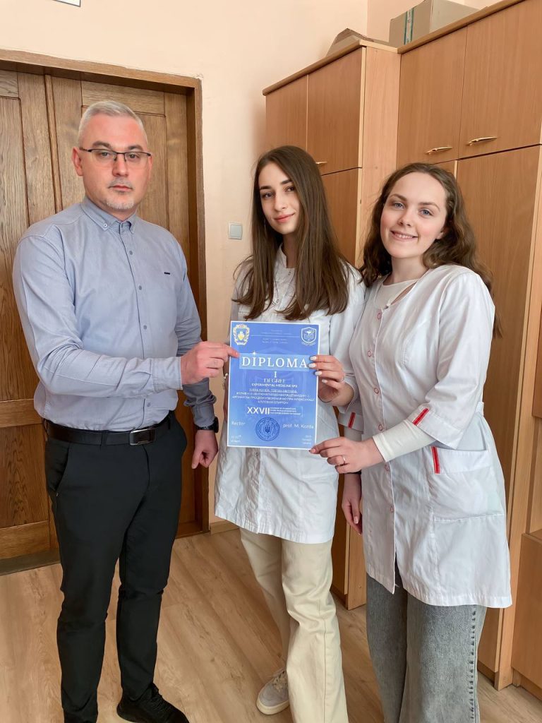 For oral presentations at the 27th International Medical Congress of Students and Young Scientists (2023), four students were awarded diplomas of the 1st degree (V. Fira, S. Chornii, U. Kotyuk, S. Tovtyn, scientific supervisors Prof. P. Lykhatskyi, Dr. Med. Sci., S. Pidruchna, and Associate Professor T. Yaroshenko) and diplomas of the 2nd degree (B. Dovgalyuk, A. Sakovets, L. Palytsia, scientific supervisor – Prof. M. Korda).