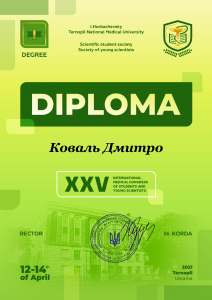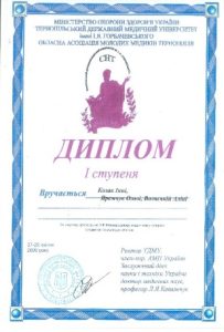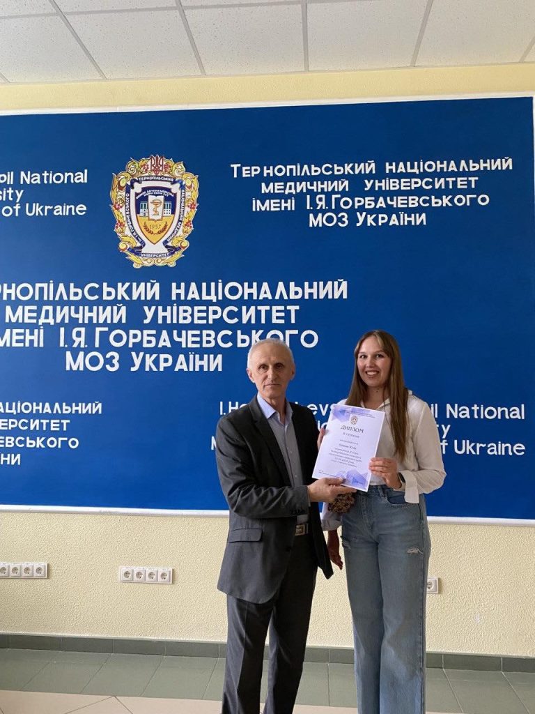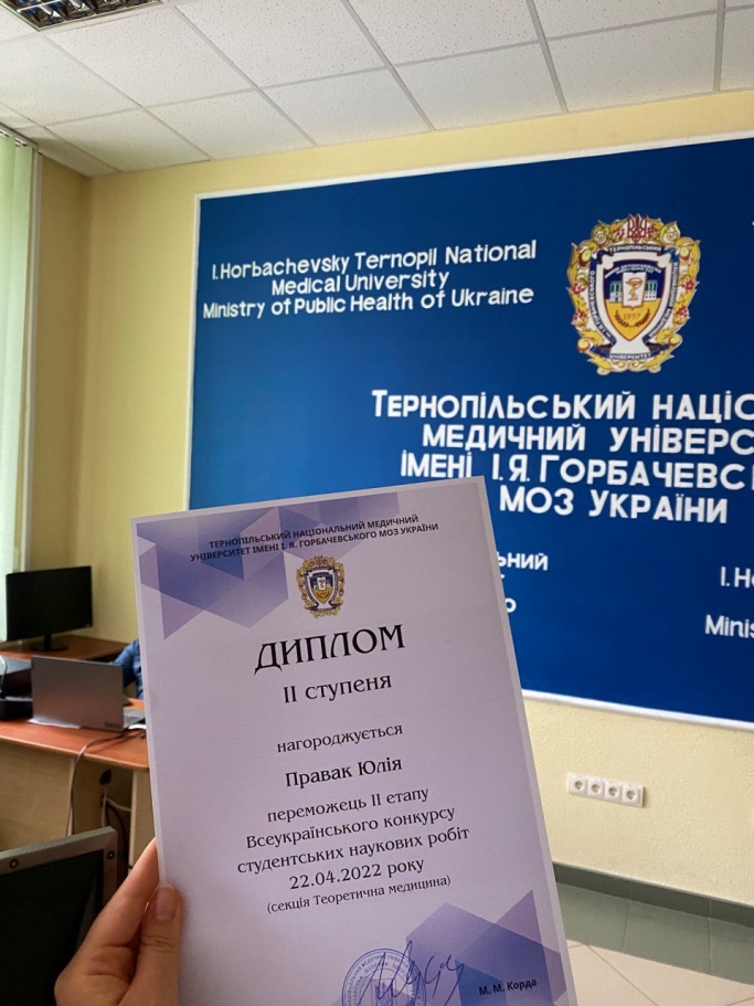 Pravak Yuliya was awarded a 2nd degree diploma for participation in the All-Ukrainian competition of student research projects (section “Theoretical Medicine”) (2022)