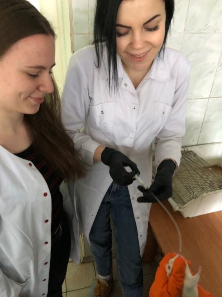 Associate Professor of the Department of Pharmacology with Clinical Pharmacology Viktor Pyda with students are conducting intragastric administration of investigated drugs to animals at the TNMU vivarium