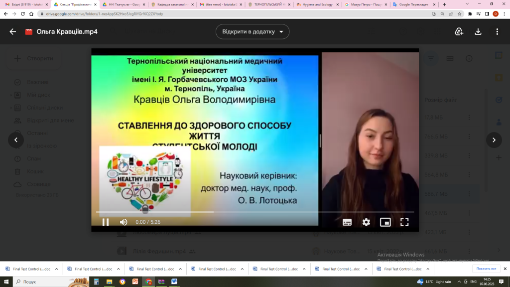 Oral presentation of Olha Kravtsiv, a 5th year student, titled “Attitude towards a healthy lifestyle of student youth” (research supervisor – prof. Olena Lototska (2021)
